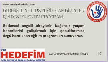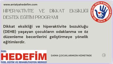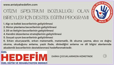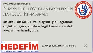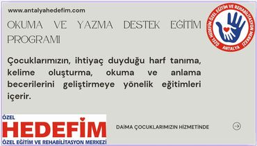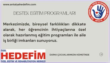 ANTALYA HEDEFİM ÖZEL EĞİTİM olarak, her öğrencinin ihtiyaçlarına uygun bireysel eğitim programları tasarlıyoruz. Öğrencilerimizin güçlü yönlerini ve gelişim alanlarını belirleyerek, onların en iyi şekilde öğrenmelerine yardımcı olmak için özelleştirilmiş stratejiler geliştiriyoruz. Amacımız, her öğrencinin potansiyelini en üst düzeye çıkarmaktır.